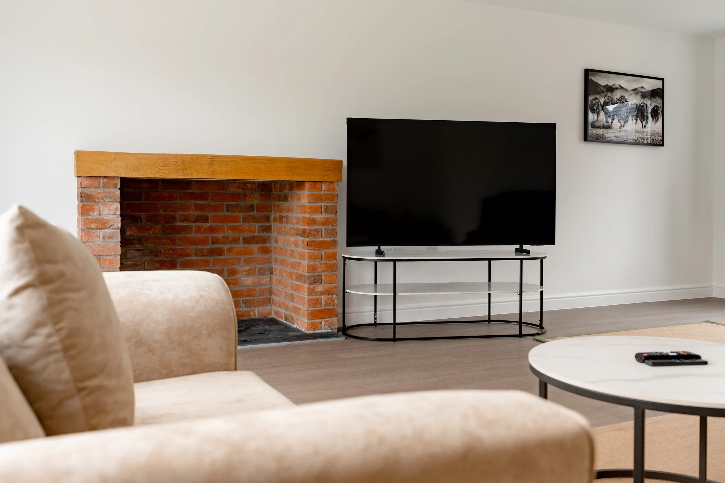 Our open plan living space features a large 2 large sofas and a 55” smart TV, creating the perfect setting to relax and unwind. The kitchen is fully equipped with premium appliances, including an fridge freezer and high-quality cooking appliances, offering both style and practicality for your stay.